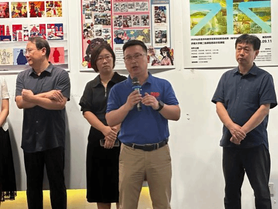 教务处张海鲲副处长致开幕词,对《插画设计》课程的教学成果给予充分的肯定,强调理论与实践教学相结合的重要性。尤其指出了课程思政在教学中的重要性,极大的肯定了授课教师王红梅将省级教学改革课题与课程汇报展出相结合,阶段性成果与多彩课题展示形式相结合的设计成果。